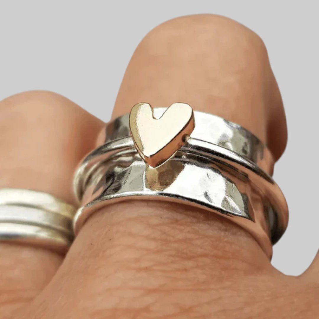 Открийте елегантността и финеса с пръстена сърце със злато и сребро Мария. Този внимателно изработен пръстен съчетава блясъка на среброто с деликатно златно сърце, символизиращо любов, надежда и личен стил. Перфектен като подарък или като израз на вашия собствен вкус, неговият вечен дизайн допълва всяка визия – от ежедневното носене до специални поводи.